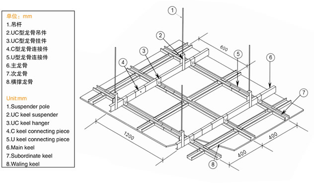 3,用挂件将次龙骨垂直固定在主龙骨上,次龙骨轴中心距为400mm