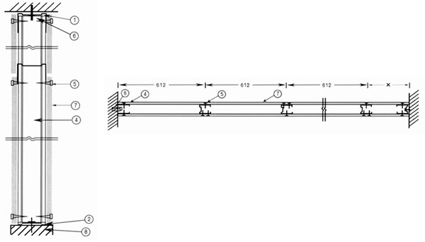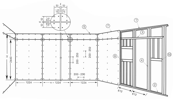 1.Roof-followed keel 2.Ground-followed keel 3.Waling keel 4.Vertical keel 5.Self-tapping screw 6.Expanding screw 7.Vogue platform board 8.Concrete washboard base (use when need waterproof) 9.Waling keel of window openings 10.Waling keel of door openings
